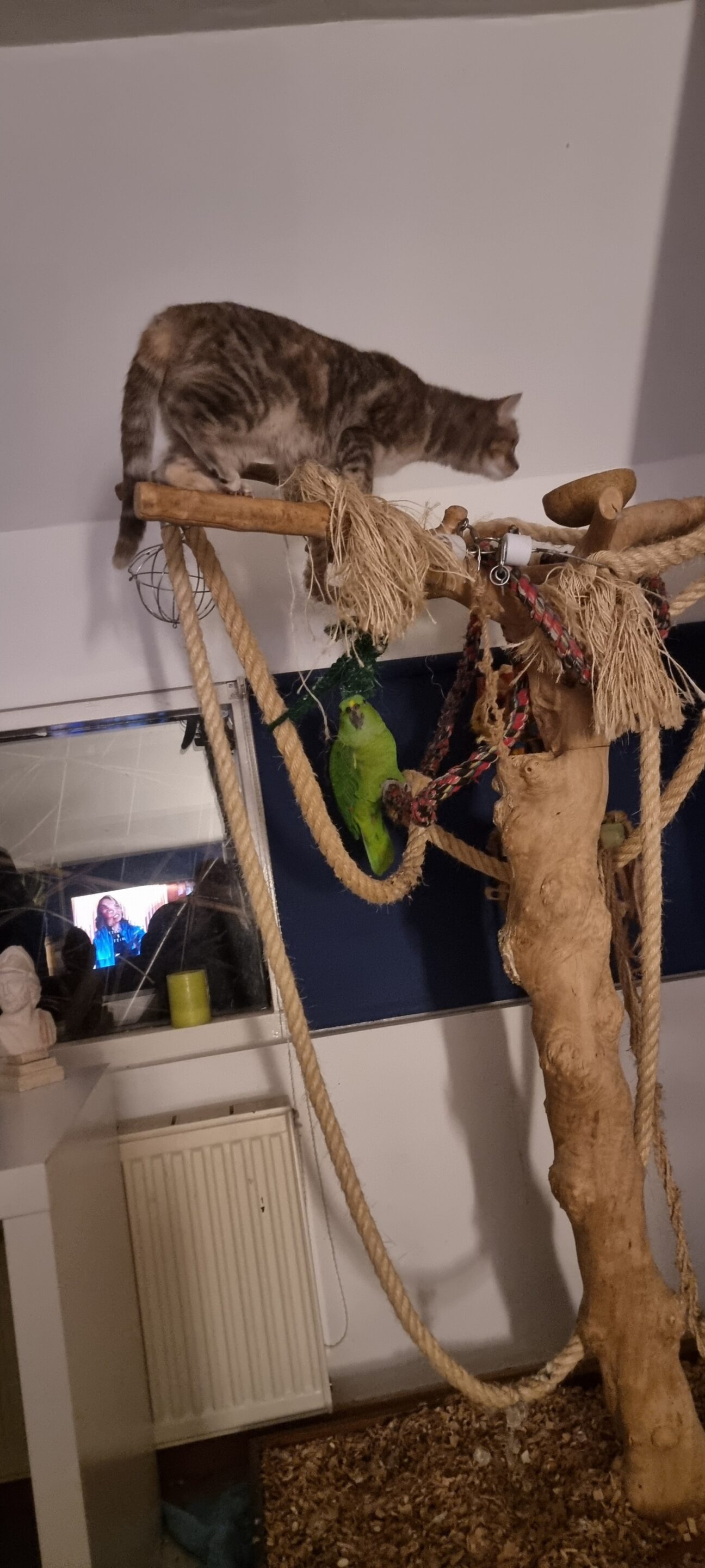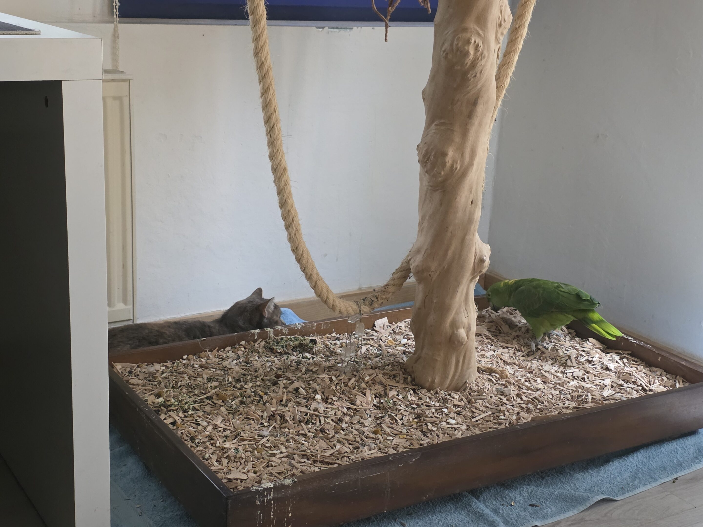 Suvi verhuist met haar kooi, haar speelboom, haar speelgoed en toebehoren vanuit Opmeer.